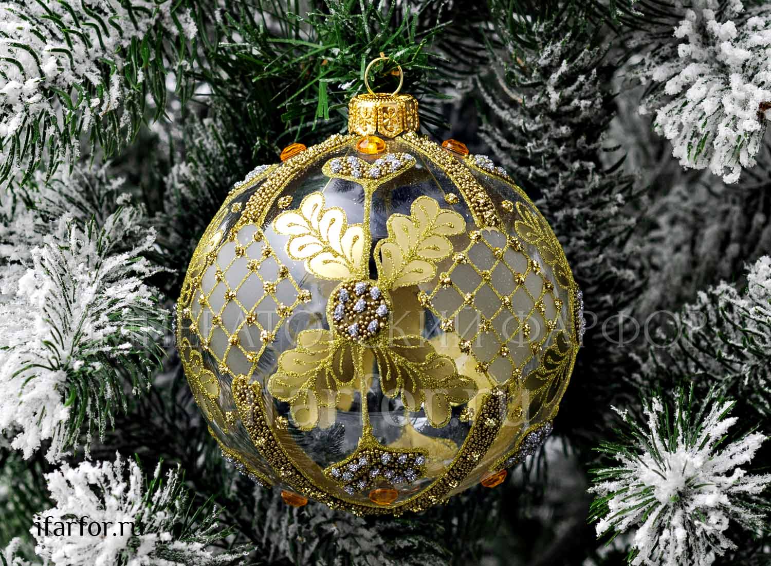 Елочная игрушка «Золотая сетка с дубовыми листьями и жёлтыми стразами»