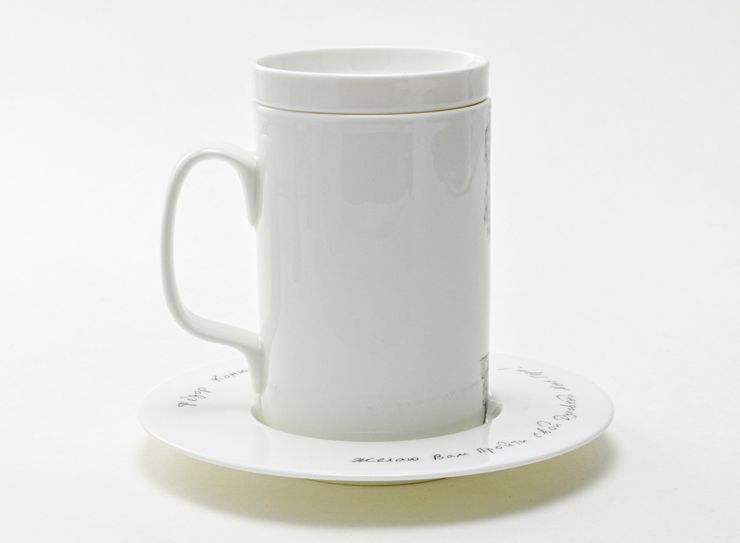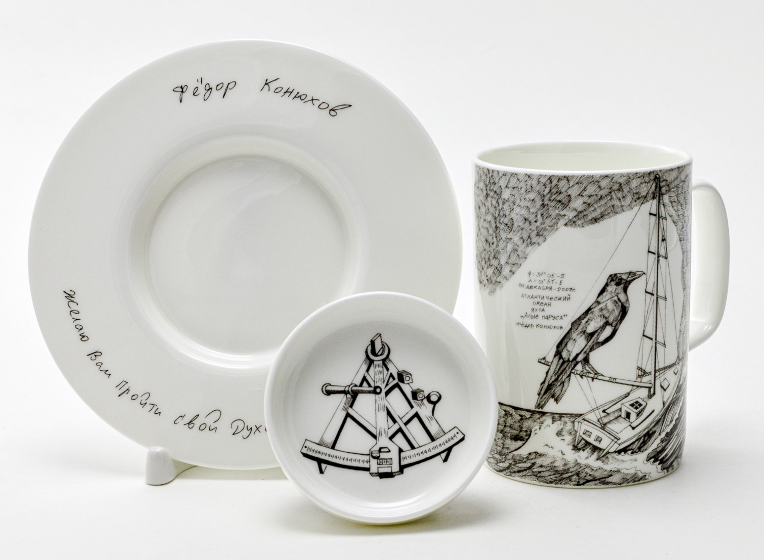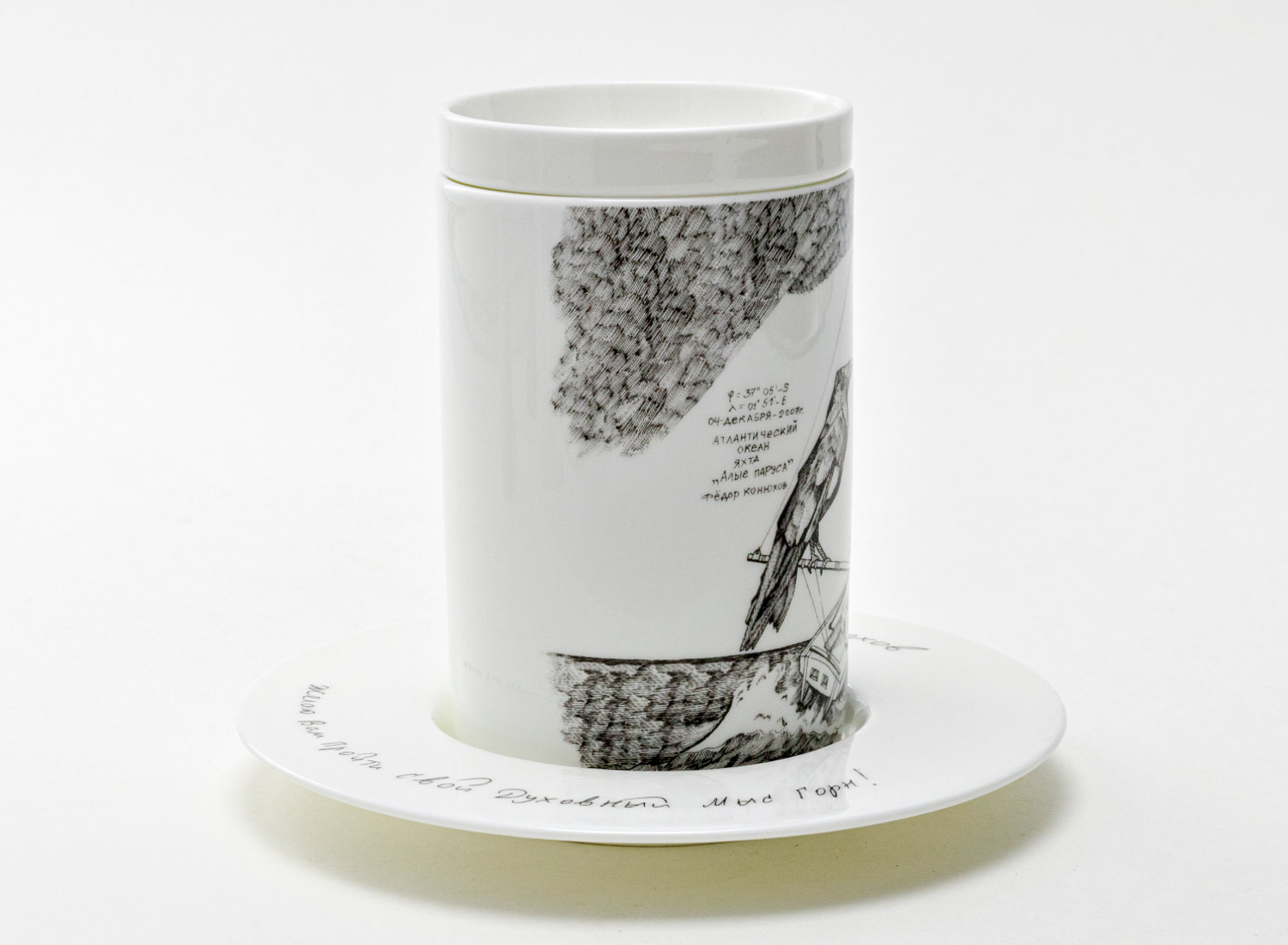 Mug with a lid and saucer in a gift box «rnFedor Konyukhov. Yacht Scarlet Sails»