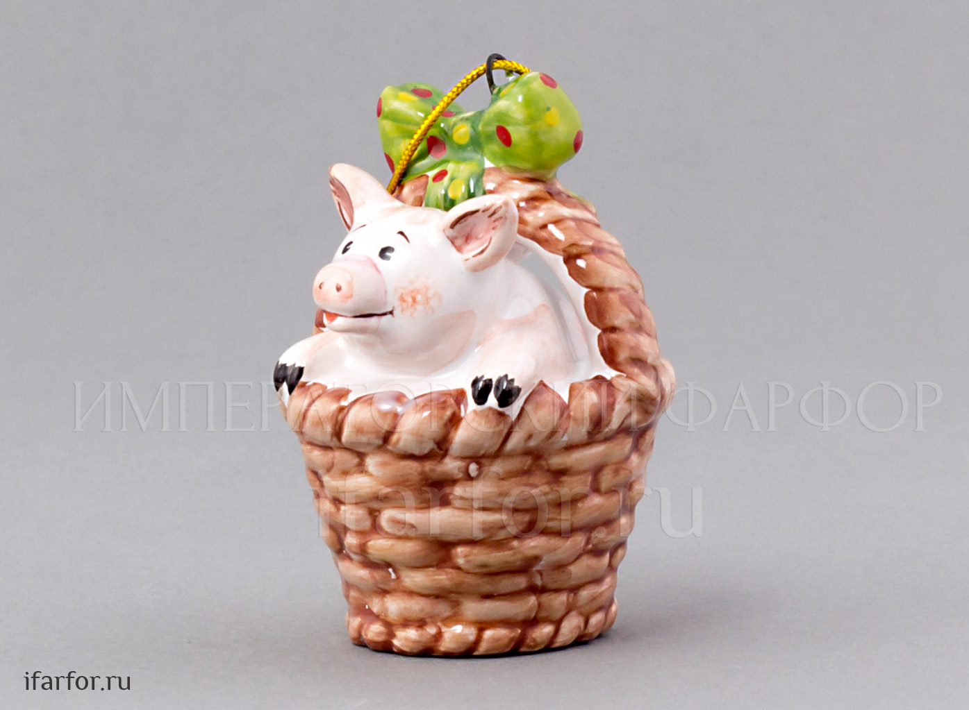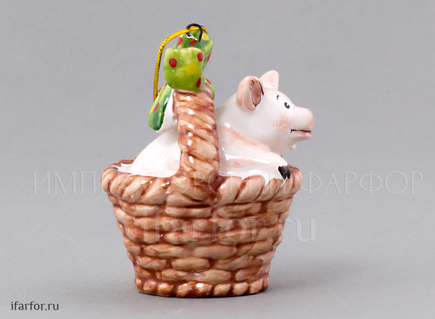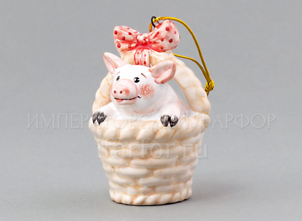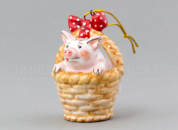 Елочная игрушка «Поросенок в корзинке с зеленым бантом»