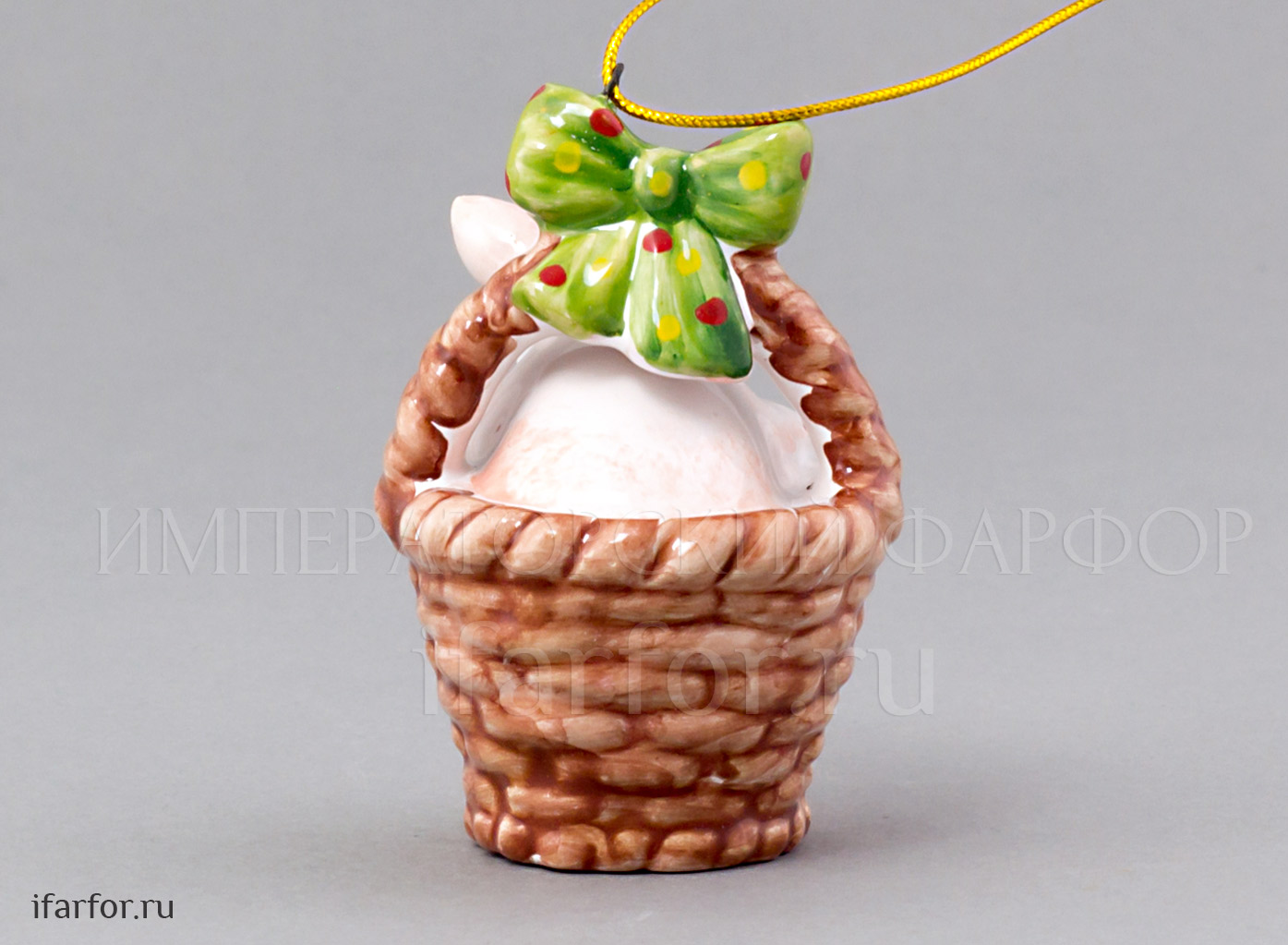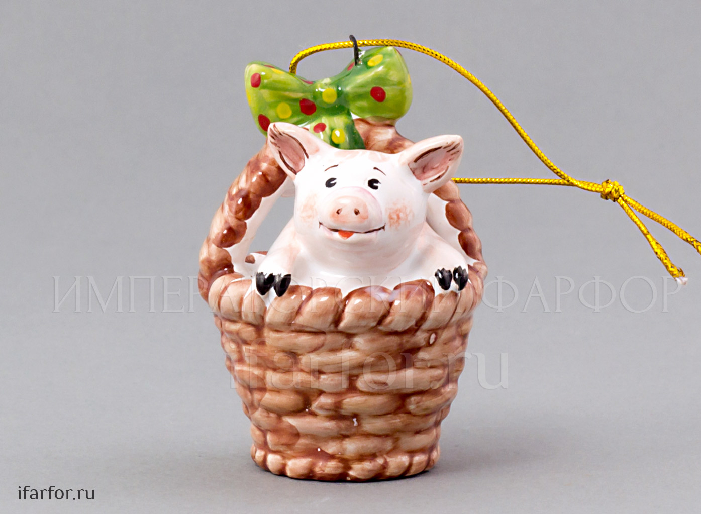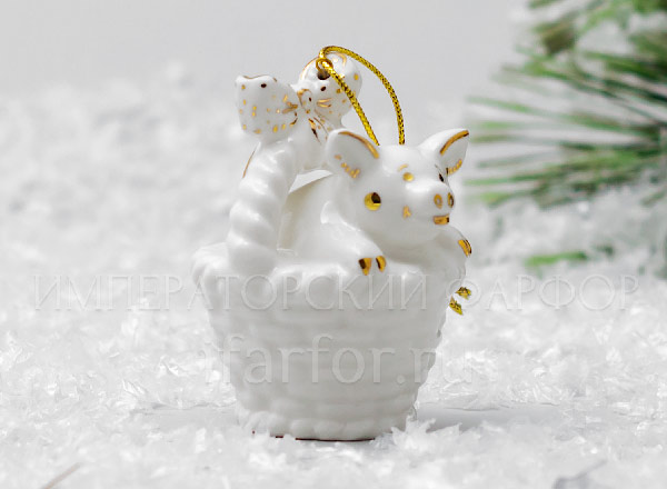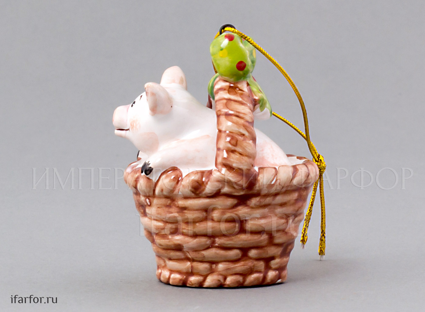 Елочная игрушка «Поросенок в корзинке с зеленым бантом»