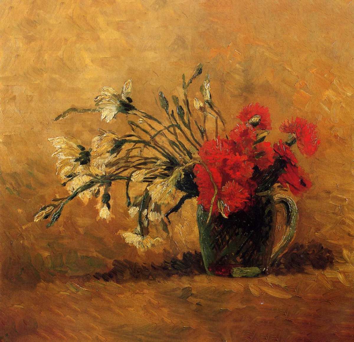 Ваза с красными и белыми гвоздиками на желтом фоне