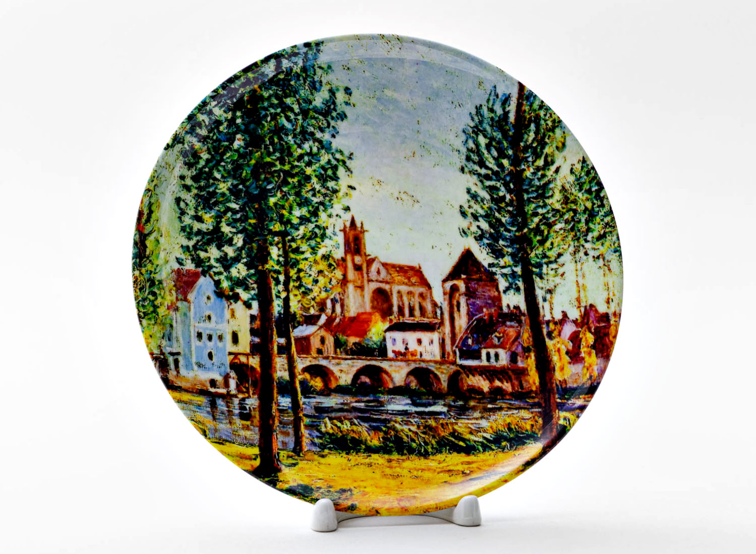 Декоративная тарелка «Moret sur Loing Bridge church and mill Sun»
