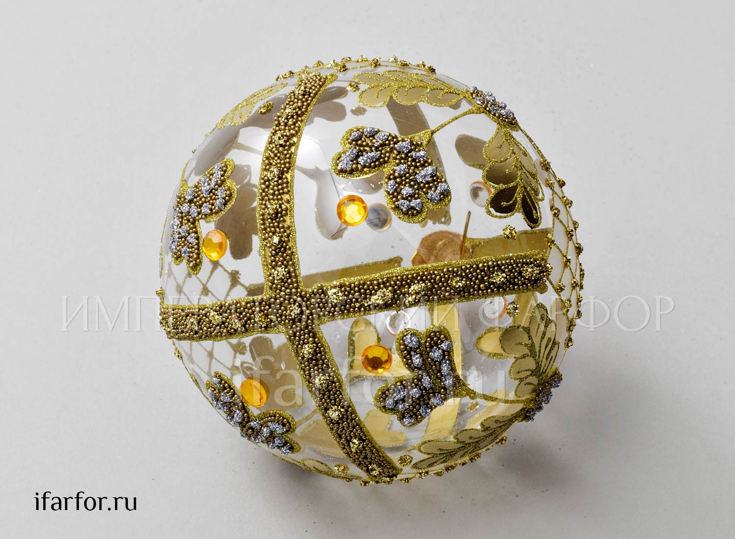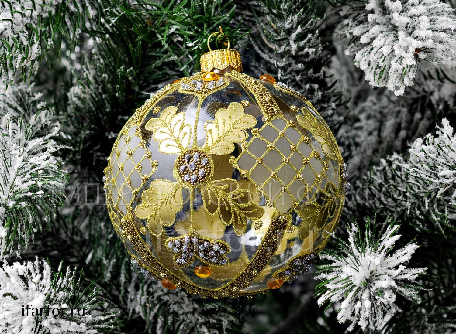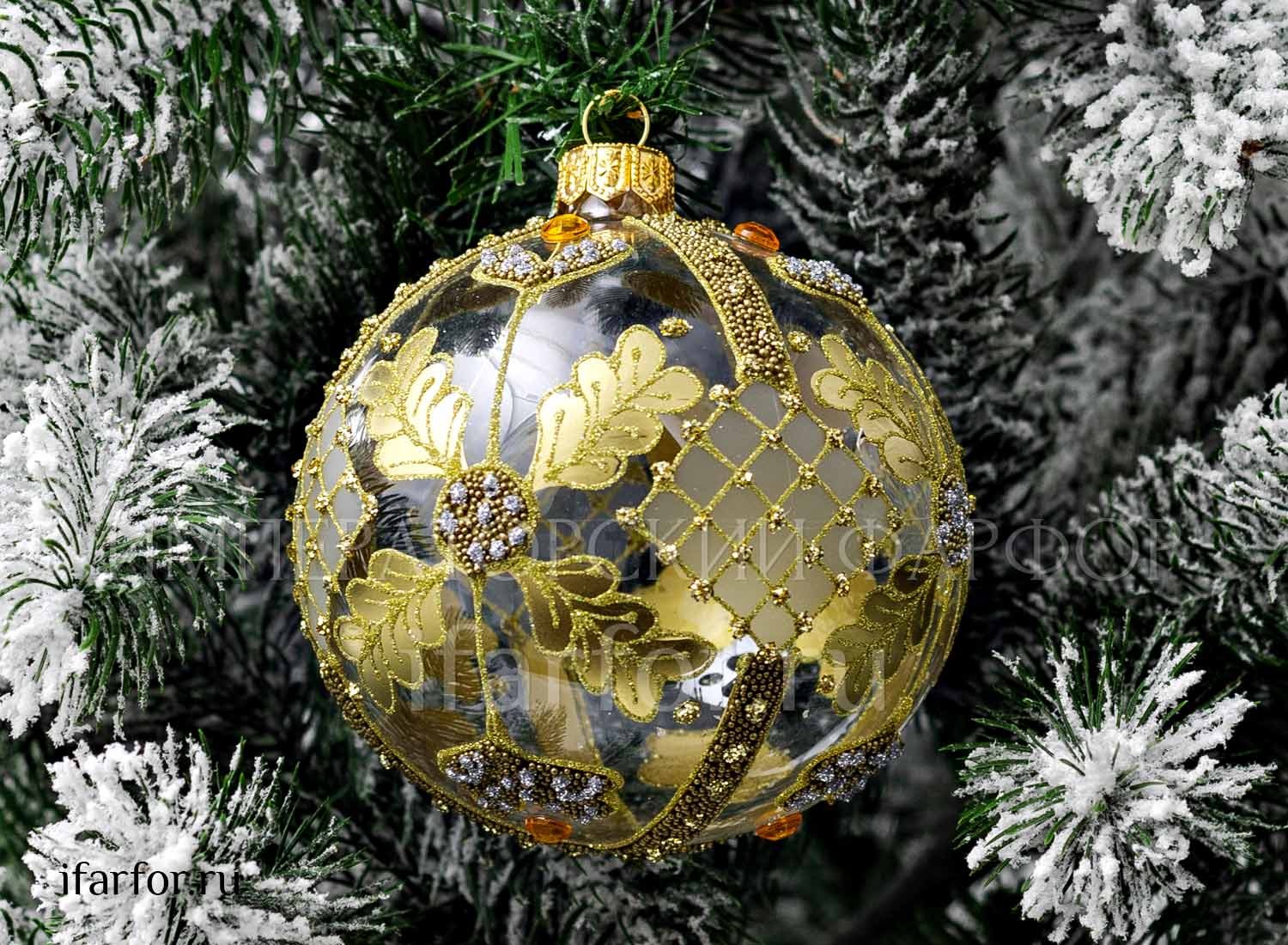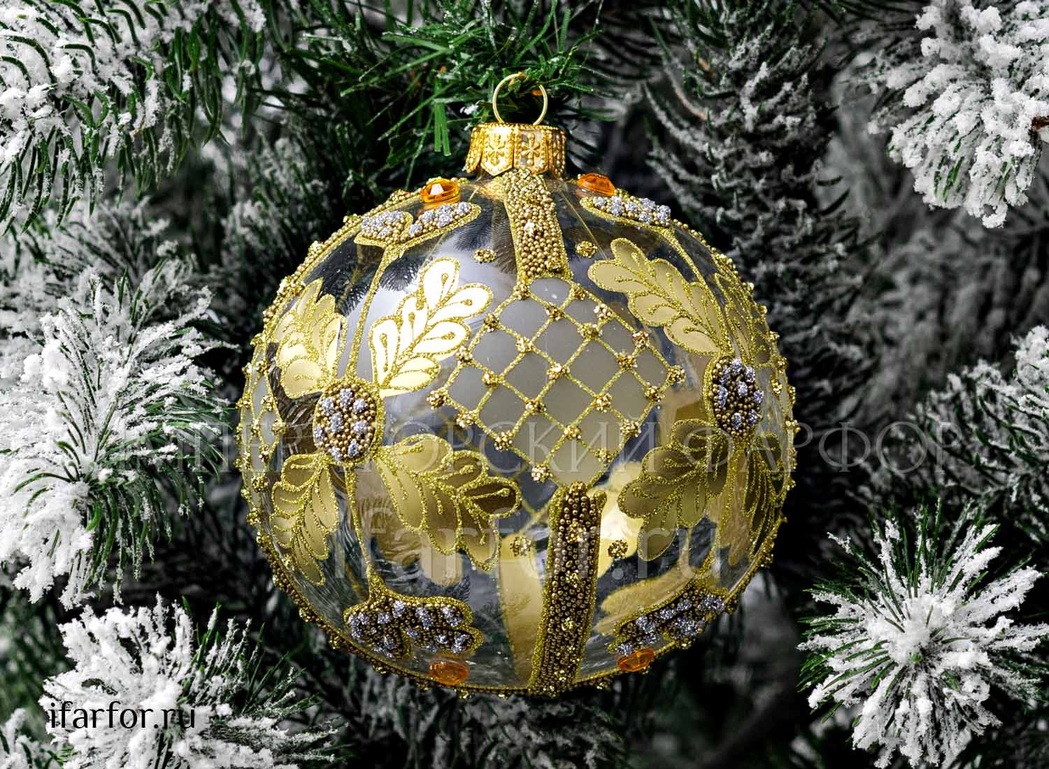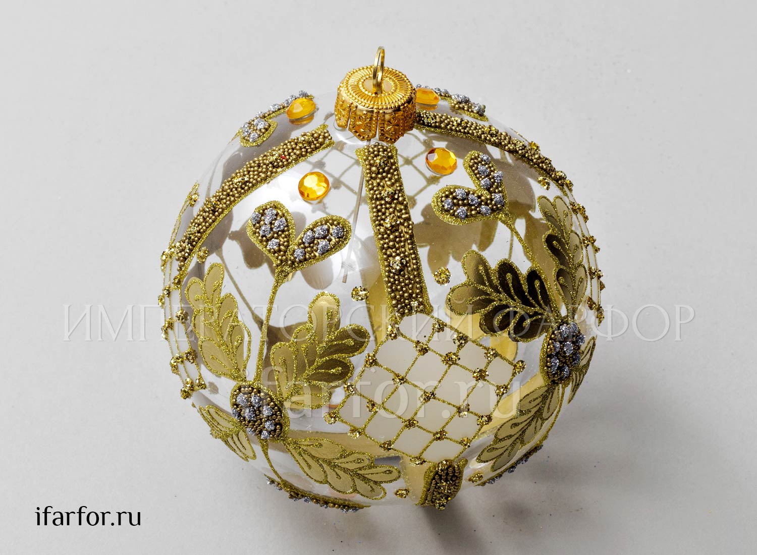 Елочная игрушка «Золотая сетка с дубовыми листьями и жёлтыми стразами»